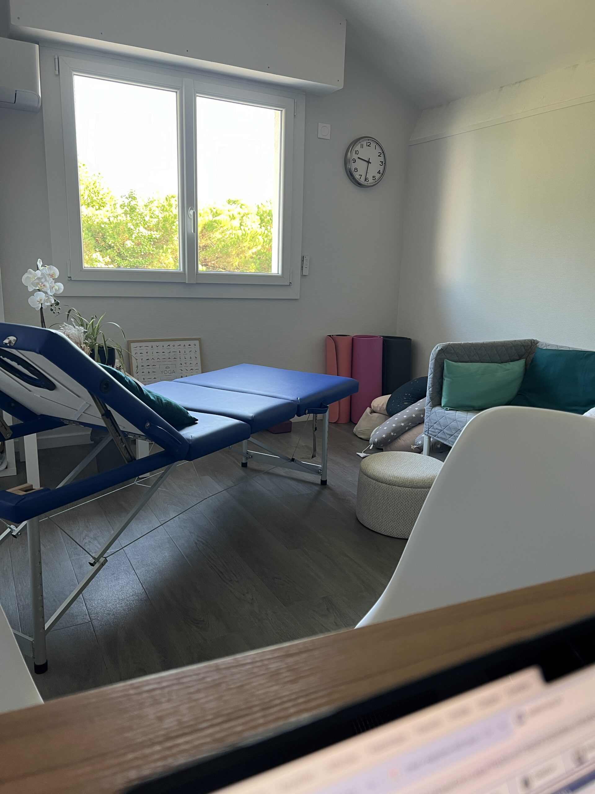 Le cabinet se compose d’une salle de consultation et d’une salle à l’étage où se déroulent les cours de préparation à la naissance et à la parentalité, les séances d’acupuncture, le yoga, le massage bébé…